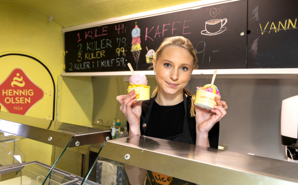 Bak hver kule står en stolt ungdom i sin første jobb, som lærer ansvar, service og jobbstolthet. Det er ikke bare is — det er arbeidsglede i praksis.